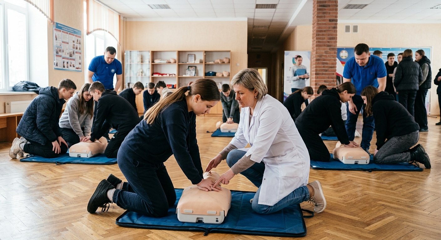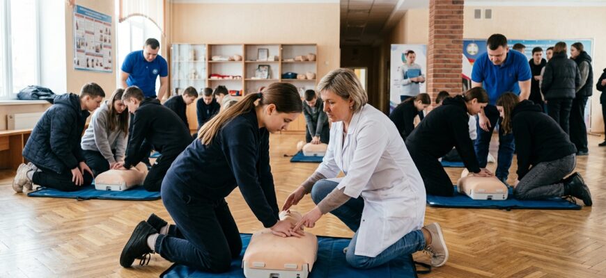 Обучение строилось по двум этапам. Первый этап включал теоретический семинар в актовом зале. Молодым людям объяснили алгоритм действий в чрезвычайной ситуации. Инструкторы рассказали, как правильно сообщить о происшествии, как безопасно для себя подойти к пострадавшему и провести его первичный осмотр. Практическая часть занятий проходила в спортивном зале учебного заведения. Такое помещение выбрали для обеспечения достаточного пространства всем желающим попробовать отработать навыки на манекенах.